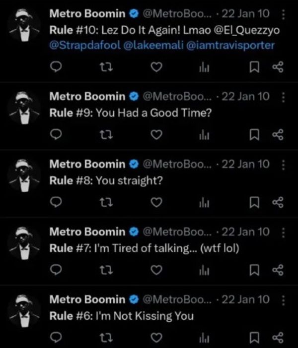 Upon reviewing Metro Boomin's old tweets, several recurring themes emerge: